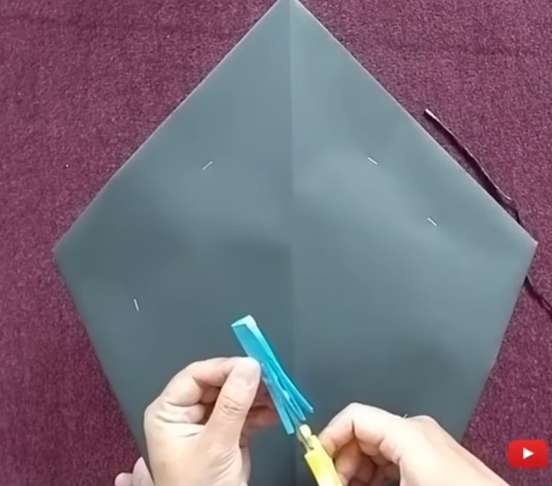 13. Selanjutnya tinggal membuat tali topi toga. Ambil kerta kecil kemudian lipat kecil seukuran jari kelingking dewasa. Selanjutnya gunting part-part menjadi beberapa seperti gambar dibawah ini.