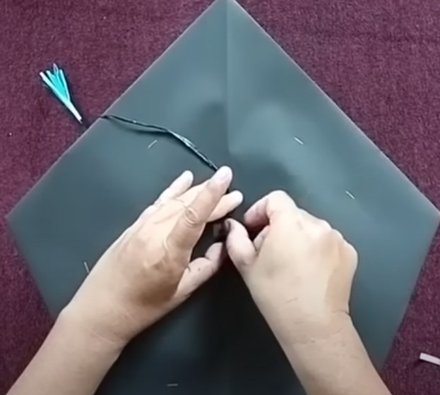 14. Selanjutnya ambil tali atau benang yang sudah disiapkan. Lem / rekatkan dengan kertas yang dibuat sehingga berbentuk seperti ujung topi toga. Tali tersebut juga jangan lupa direkatkan (dilem) pada bagian tengah toga seperti gambar dibawah ini.